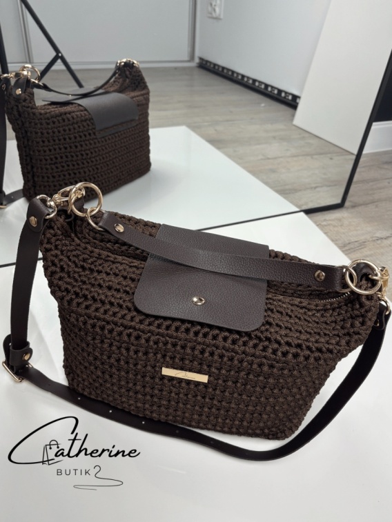 Elegancka, ręcznie robiona torebka Catherine Bella to połączenie klasy, kobiecości i wyjątkowego stylu handmade. Wykonana z wysokiej jakości, trwałego sznurka w głębokim odcieniu czekolady, zachwyca swoją strukturą i ponadczasowym designem.